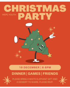 All WEPC youth students and their friends are invited to this awesome party. Please bring a white elephant gift. The cost per person for this event is $5 and it includes dinner.