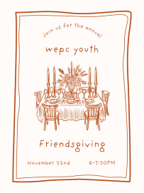 Join us for food, games, and a fun time celebrating Thanksgiving with dear friends. Youth Ministry will provide drinks, but we would love for you to bring a dish to share.